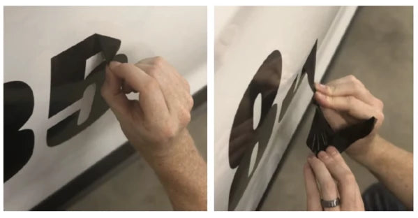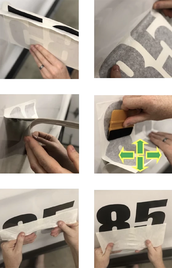 - Once the transfer tape and numbers are applied securely to the surface, pull the transfer tape off the surface in a 180 degree angle, leaving the numbers securely on the surface